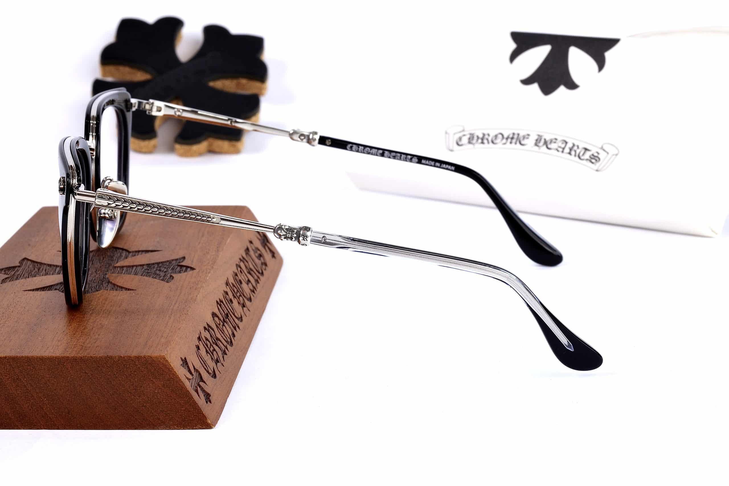 Mẫu biểu tượng của Chrome Hearts – kết hợp hoàn hảo giữa gọng acetate đen và bạc thủ công khắc họa tiết nổi bật.